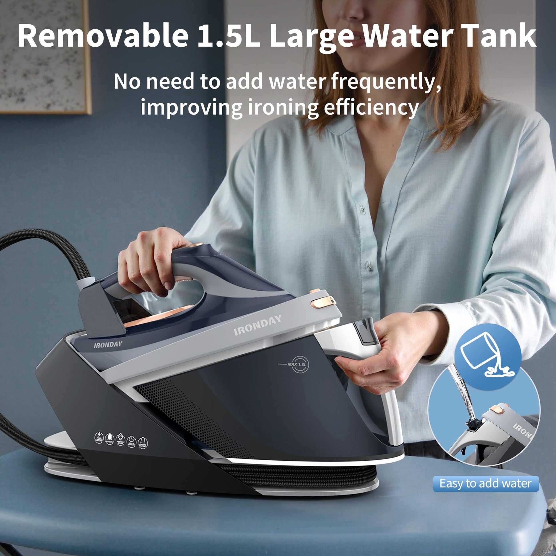 - [1.5L/50.7oz Long-Lasting Reserve] Enjoy uninterrupted ironing with the spacious 1.5L removable water tank. Its large capacity ensures a long-lasting steam reserve, reducing the need for frequent refill water and making it perfect for tackling large loads of laundry efficiently