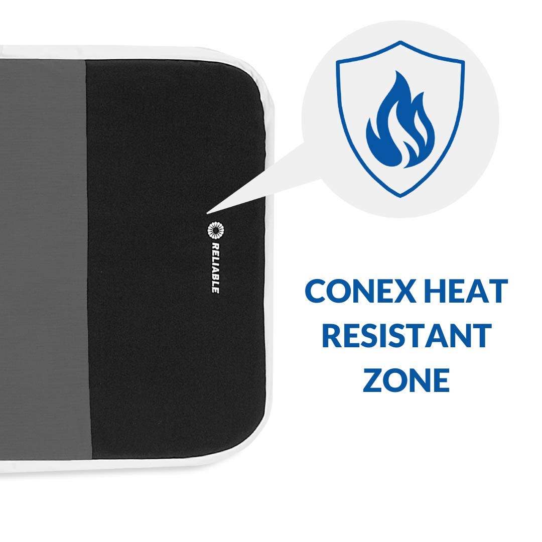 - Conex Heat Resistant Zone - Allows you to place your iron on the board with no worries. This safe zone is heat resistant to over 400°F and is a flame retardant. Simplify your ironing experience with a Conex Heat Resistant Zone